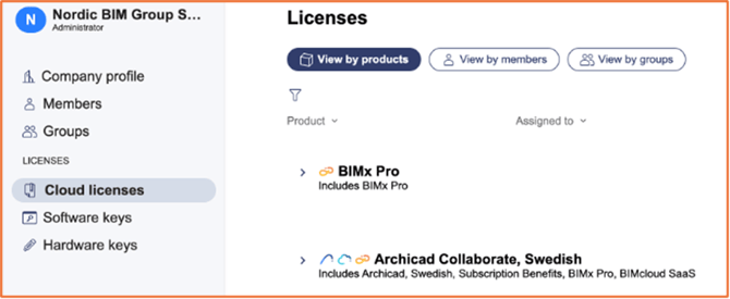 - Klikk på Cloud Licenses for å få en oversikt over hvilke produkter og lisenser som er knyttet til bedriften.