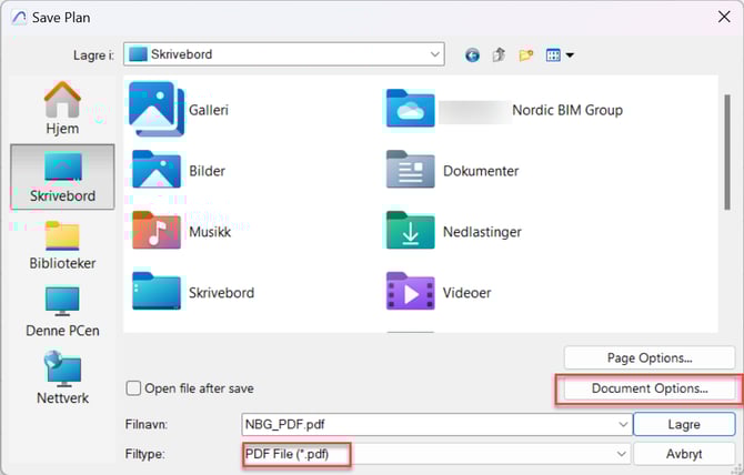 Dette er metoden som er anbefalt. Ved å bruke save as eller publish til PDF er det Archicad som setter kravene til geometrien, ikke PDF-oversetteren. Du kan stille inn eventuelle spesifiseringer av sideoppsett under document options..