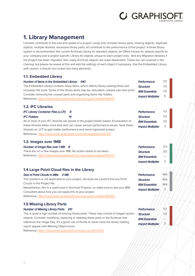 Vi er sertifisert av Graphisoft til å utføre en dyptgående og systematisk helsesjekk av Archicad-prosjekter. Med vår Helsesjekk gjennomgår vi en liste på over 100 punkter, dette ved hjelp av spesialutviklede verktøy og prosesser, som resulterer i en svært detaljert rapport. Vi bistår deretter med gjennomgang av rapporten og utvikler tiltak og forbedringsprosesser for å unngå fremtidige flaskehalser.