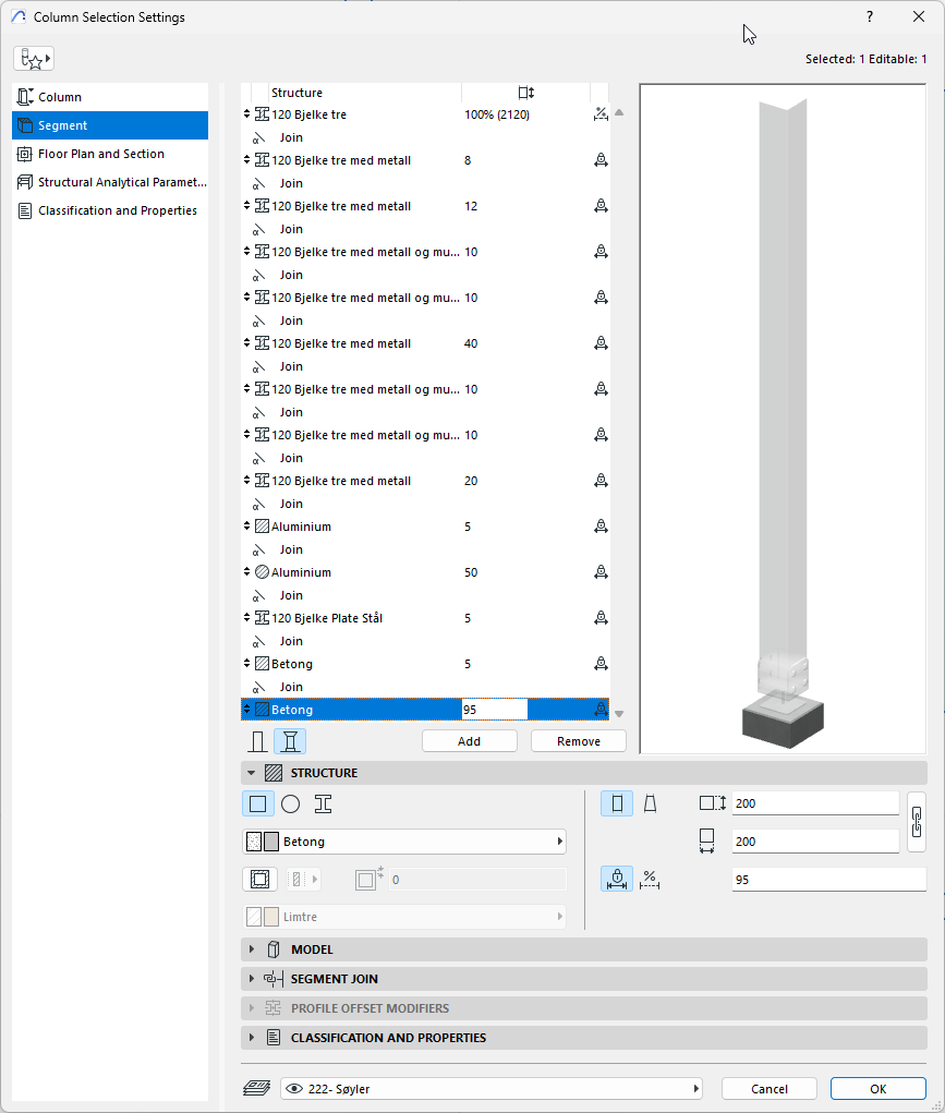 I Archicad har vi muligheten til å spesifisere at søylene våre skal bestå av forskjellige segmenter. Hvert segment kan bestå av en kompleks profil. Komplekse profiler har muligheten til å være dynamiske i forhold til å endre form fra ett segment til et annet.