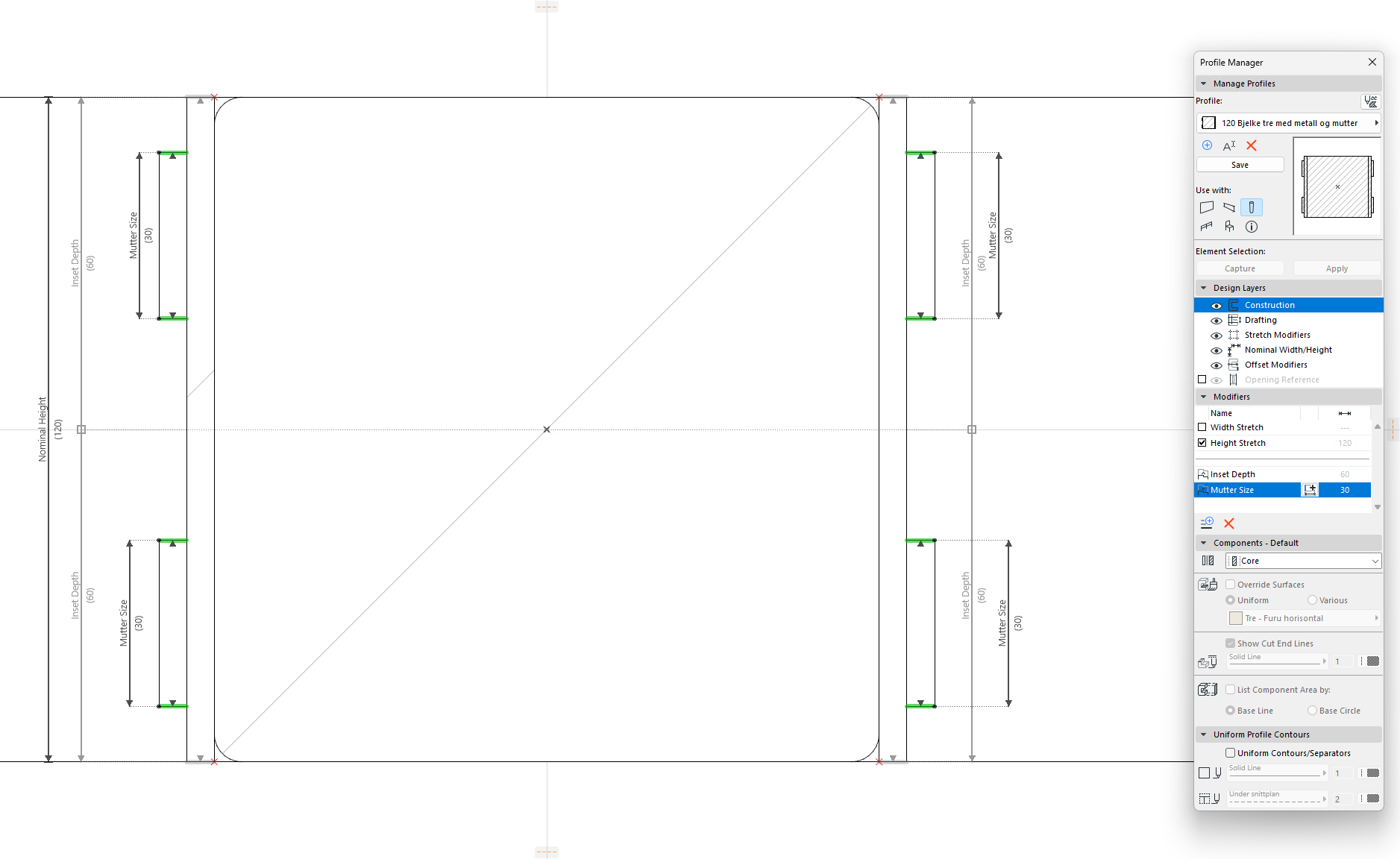 Over kan du se innstillingene for søylen. Under legger jeg inn illustrasjoner av den profilen som har trebjelke, metall på sidene og mutter.