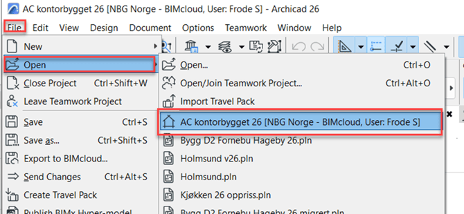 "Save" fungerer som en lokal sikkerhetskopi på din egen maskin (Local Teamwork Data), noe som kan være redningen hvis BIMcloud-serveren skulle bli skadet. Du kan åpne en lokal Teamwork-fil via File > Open > Recent Files.