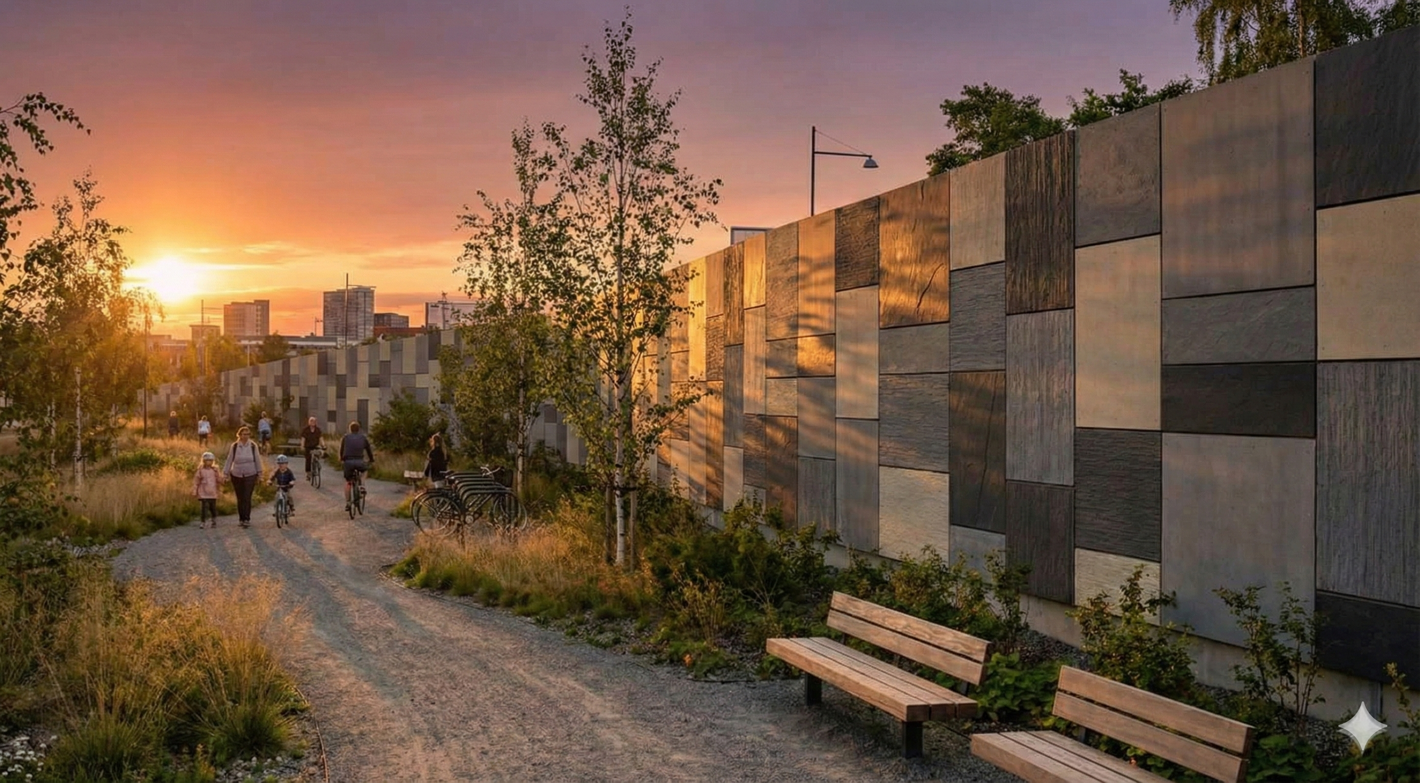 Men tänk om bullerskärmen kunde bli motsatsen till linjär? Tänk om restmaterial inte var “skräp”, utan ett designbibliotek?